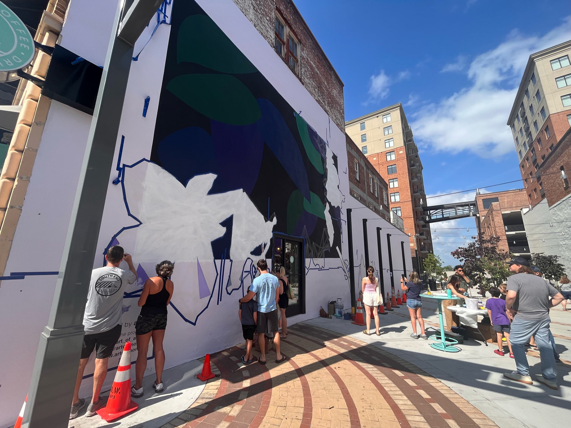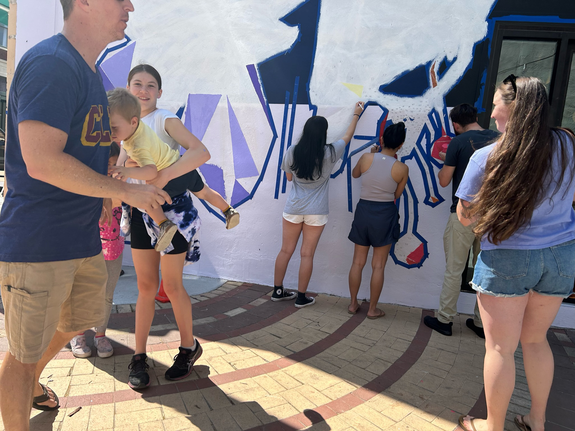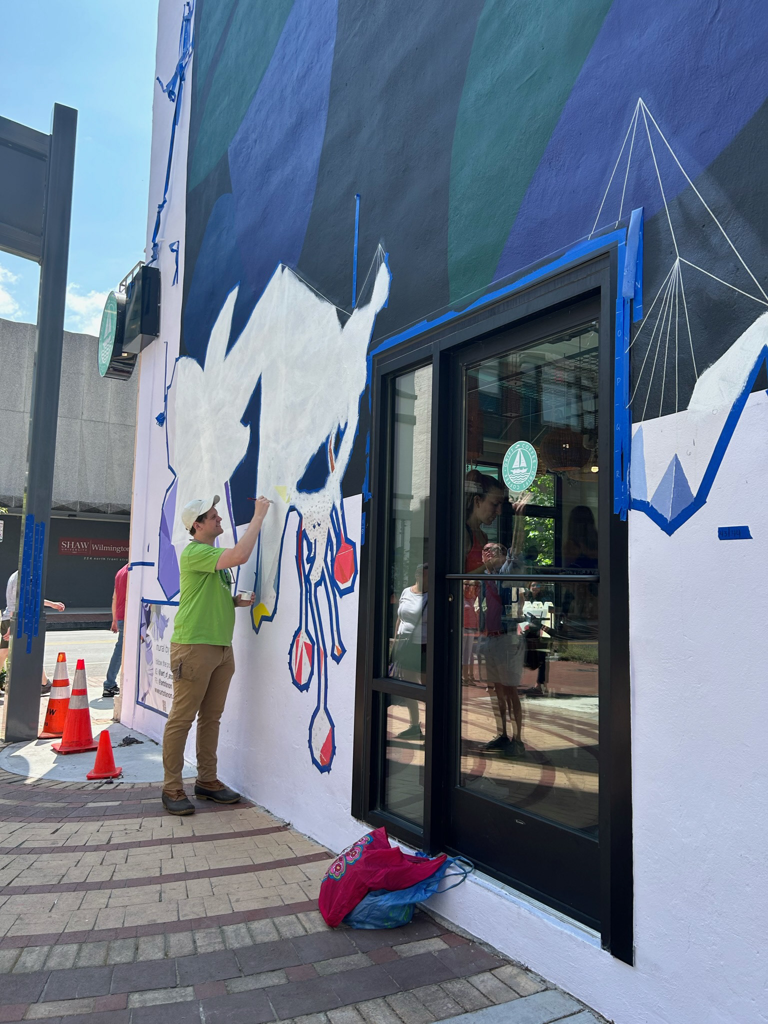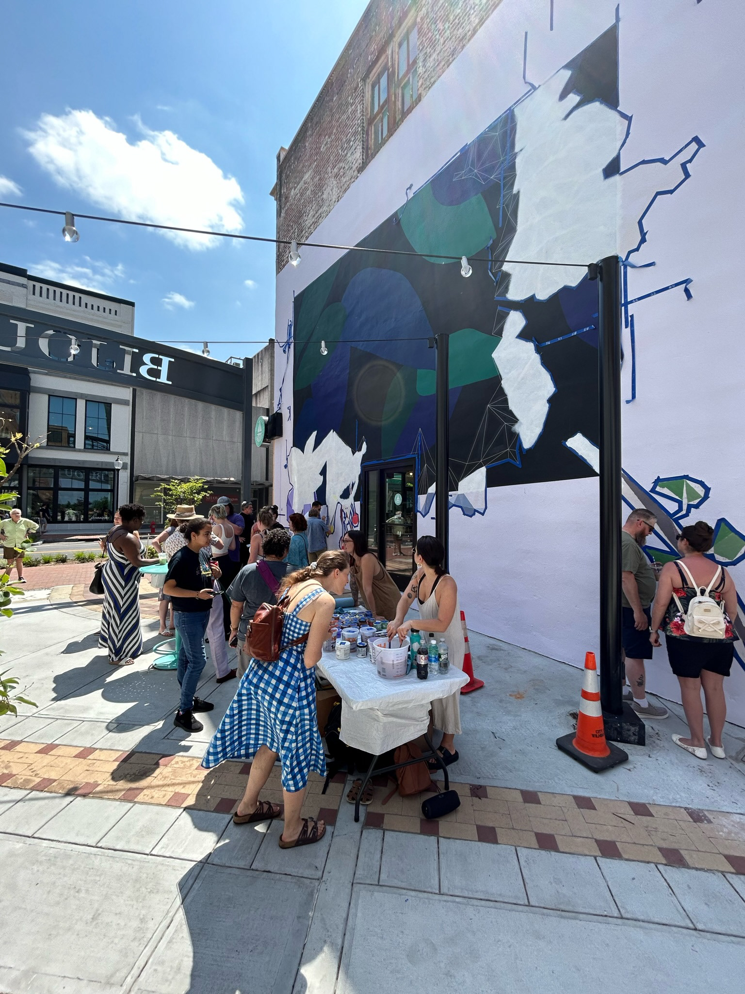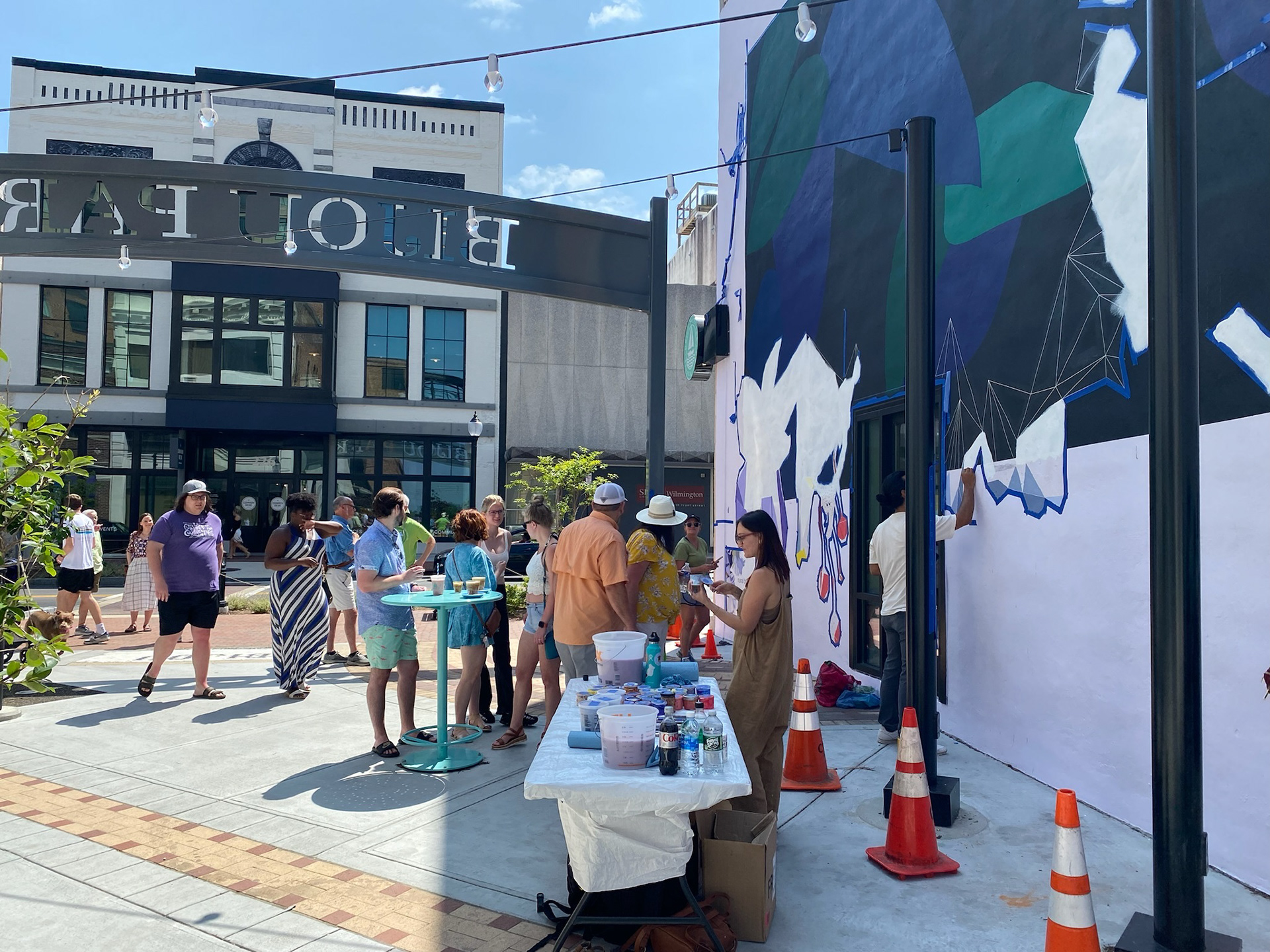 Commissioned by the Arts Council of Wilmington, North Carolina, this mural serves as the "last piece" of a newly renovated historic space in the heart of downtown Wilmington and also as downtown's first large scale mural. Originally the site for North Carolina's first movie theater, Bijou Park is now a connecting corridor linking their Main Street to the river front and a convenient, beautiful respite from the city's hustle and bustle. The narrative pays homage to the movie theater while highlighting North Carolina's natural "jewels" (Bijou means small, precious jewel), and offers a nod to this pocket park as downtown's newest "hidden gem." This massive piece had a community component in which over 500 people helped paint the mural over the course of a weekend.