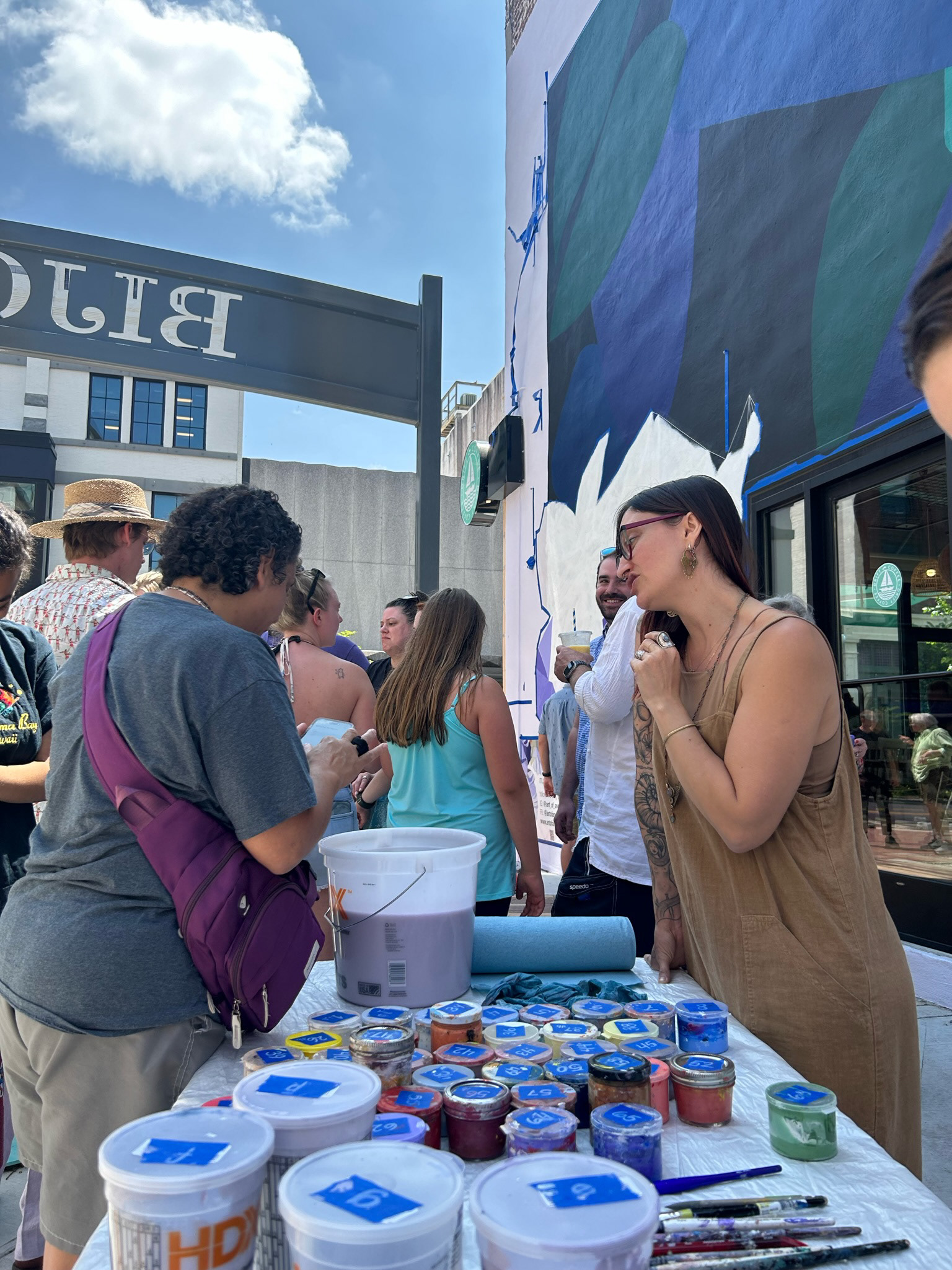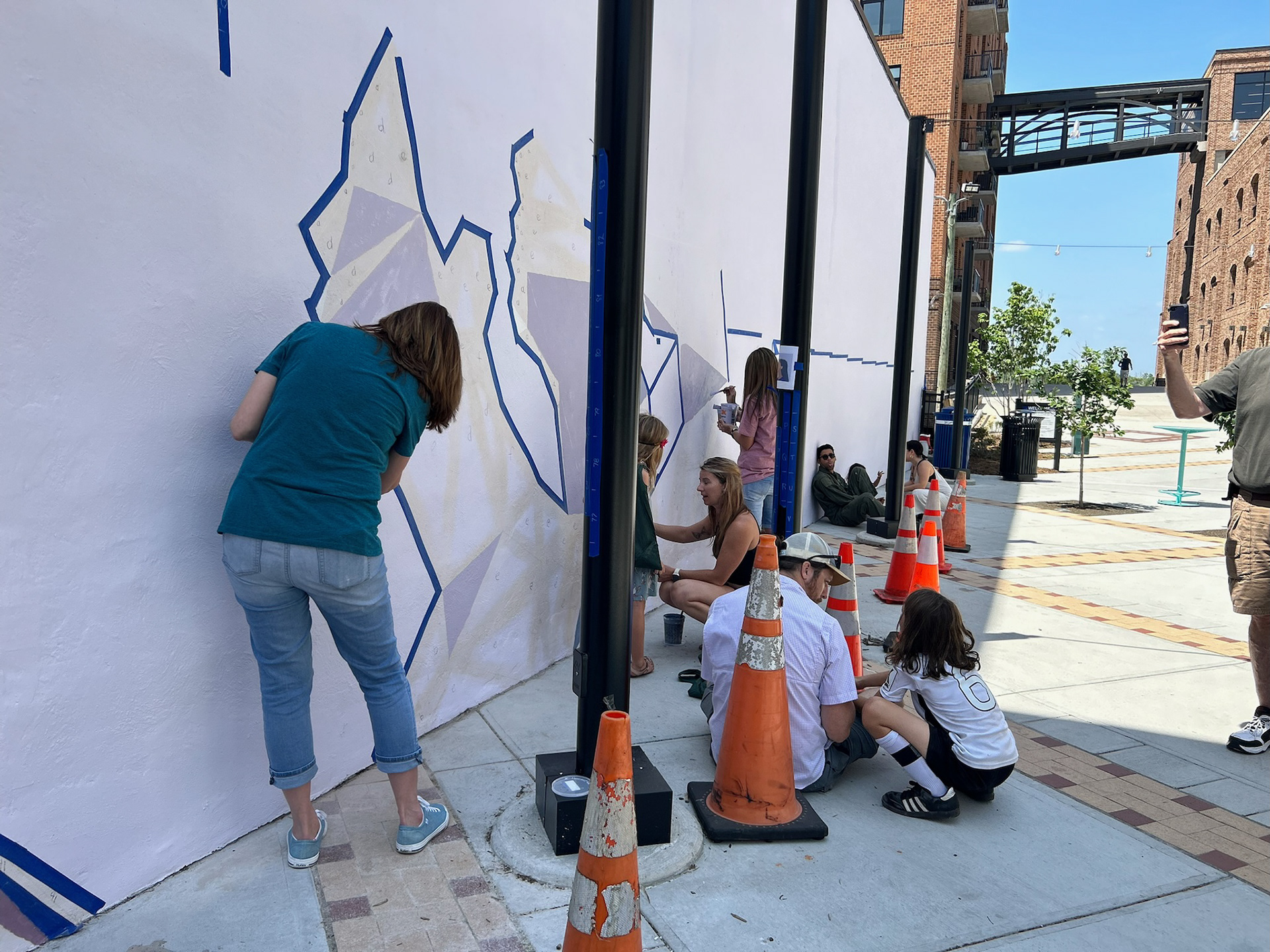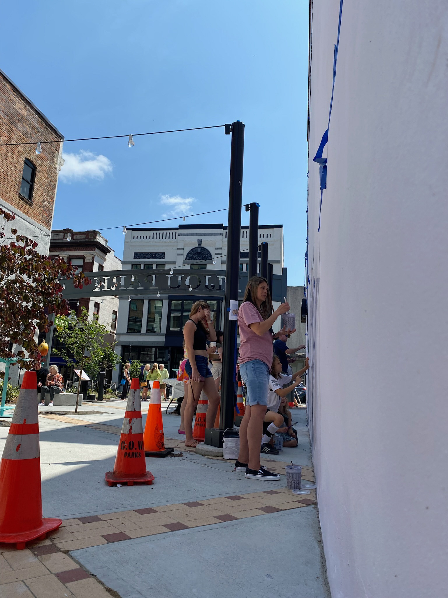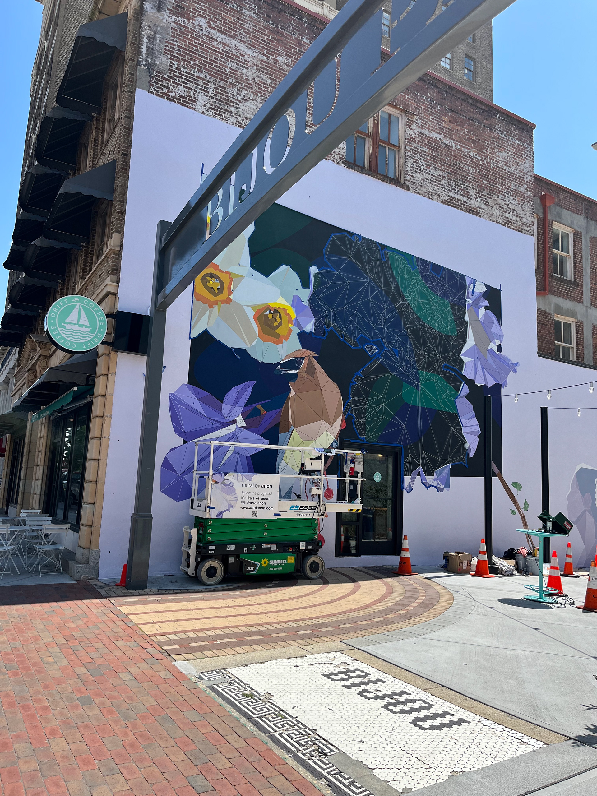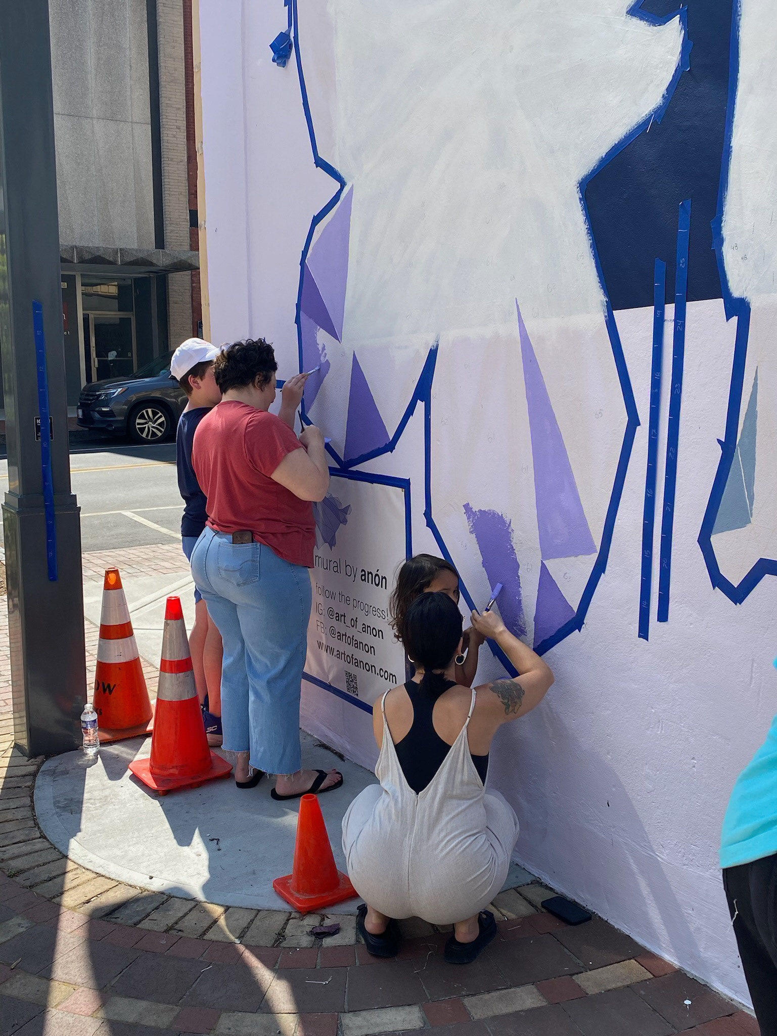 Commissioned by the Arts Council of Wilmington, North Carolina, this mural serves as the "last piece" of a newly renovated historic space in the heart of downtown Wilmington and also as downtown's first large scale mural. Originally the site for North Carolina's first movie theater, Bijou Park is now a connecting corridor linking their Main Street to the river front and a convenient, beautiful respite from the city's hustle and bustle. The narrative pays homage to the movie theater while highlighting North Carolina's natural "jewels" (Bijou means small, precious jewel), and offers a nod to this pocket park as downtown's newest "hidden gem." This massive piece had a community component in which over 500 people helped paint the mural over the course of a weekend.